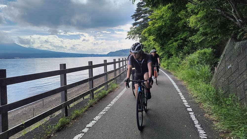 この日は、雲がかかっていて富士山を拝むことはかないませんでしたが、美しい山中湖畔を走るサイクリングロードを気持ちよく走ることができました。