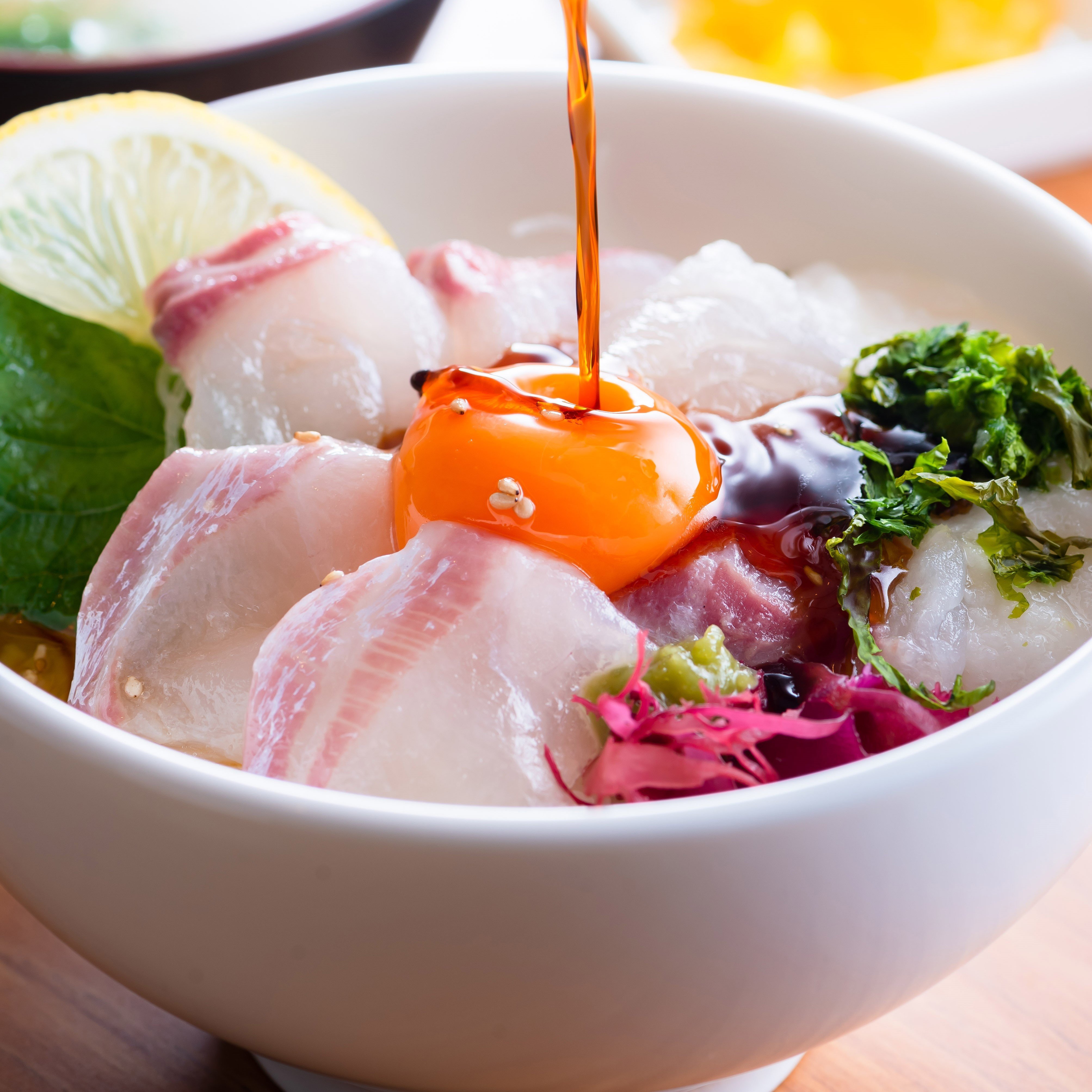 宇和島風鯛めし:新鮮な鯛の刺身を特製のタレと生卵に絡め、ご飯にのせていただくスタイル。ぷりぷりの身とタレの濃厚な旨みが口いっぱいに広がり、何杯でも食べたくなる味わい。