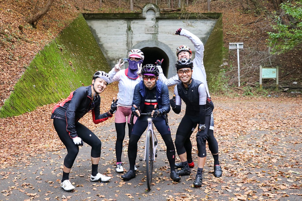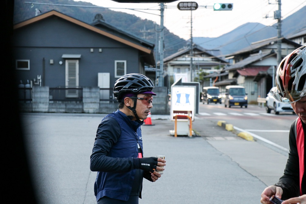 下りきった先で短い補給を挟み、各自のペースでウェアやウォーマーを調整。