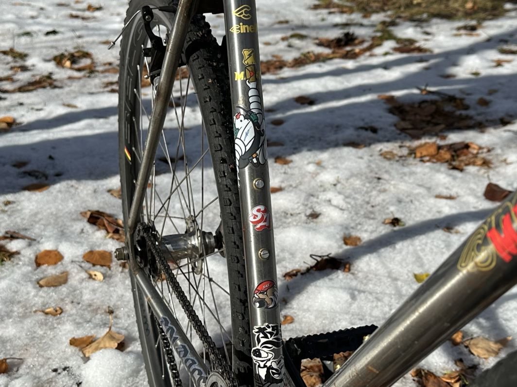 砂利道や泥道などの悪路で使われるブロックタイヤは舗装路で使うとどうしても漕ぎ味が重たくなりますが、そんな事は気にせず見た目がカッコいいという理由で愛用しています。