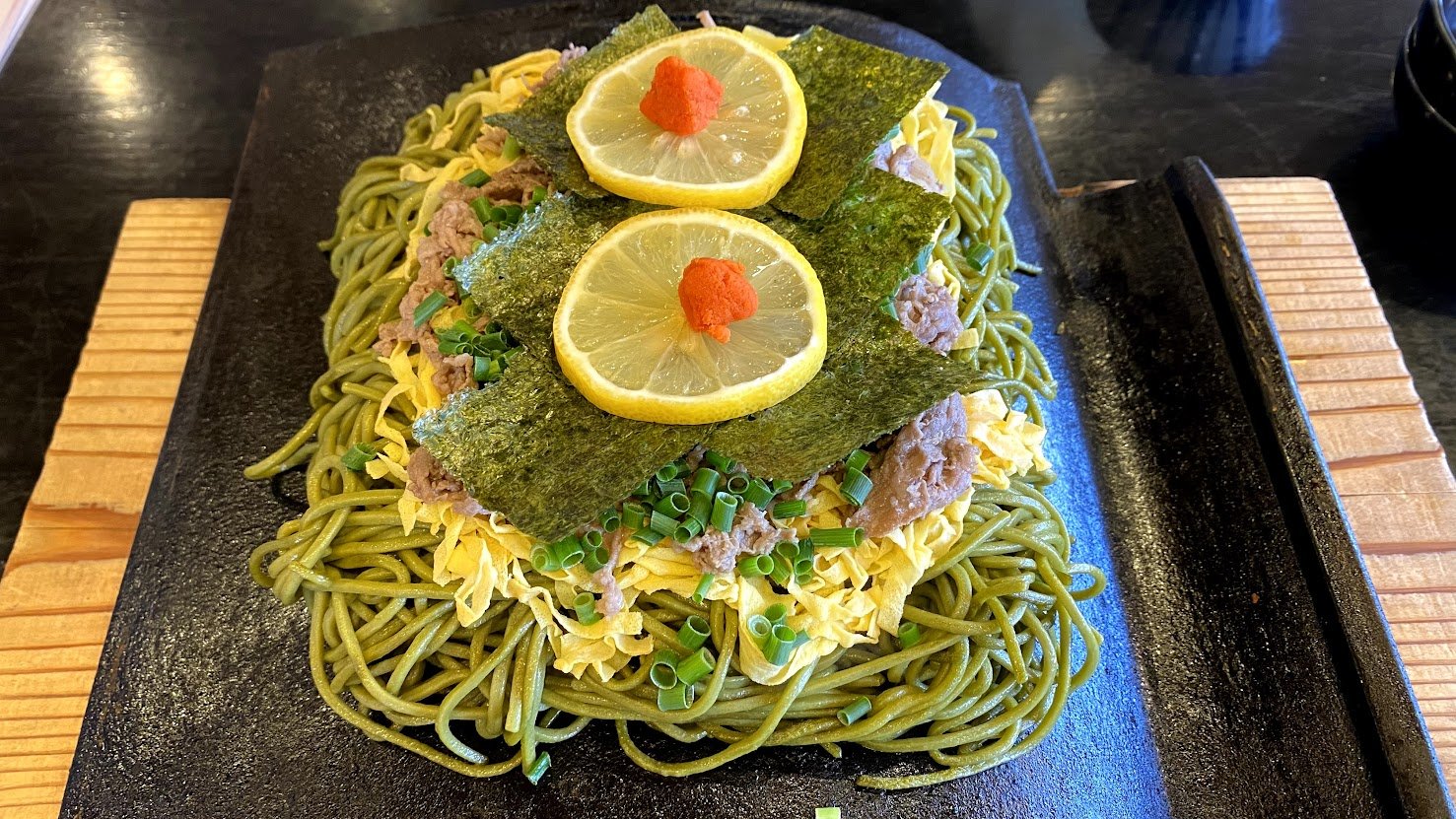 パリッと焼かれた熱々の瓦の上で茶そばを焼き、甘辛のつゆでいただくスタイルはここだけの体験です。