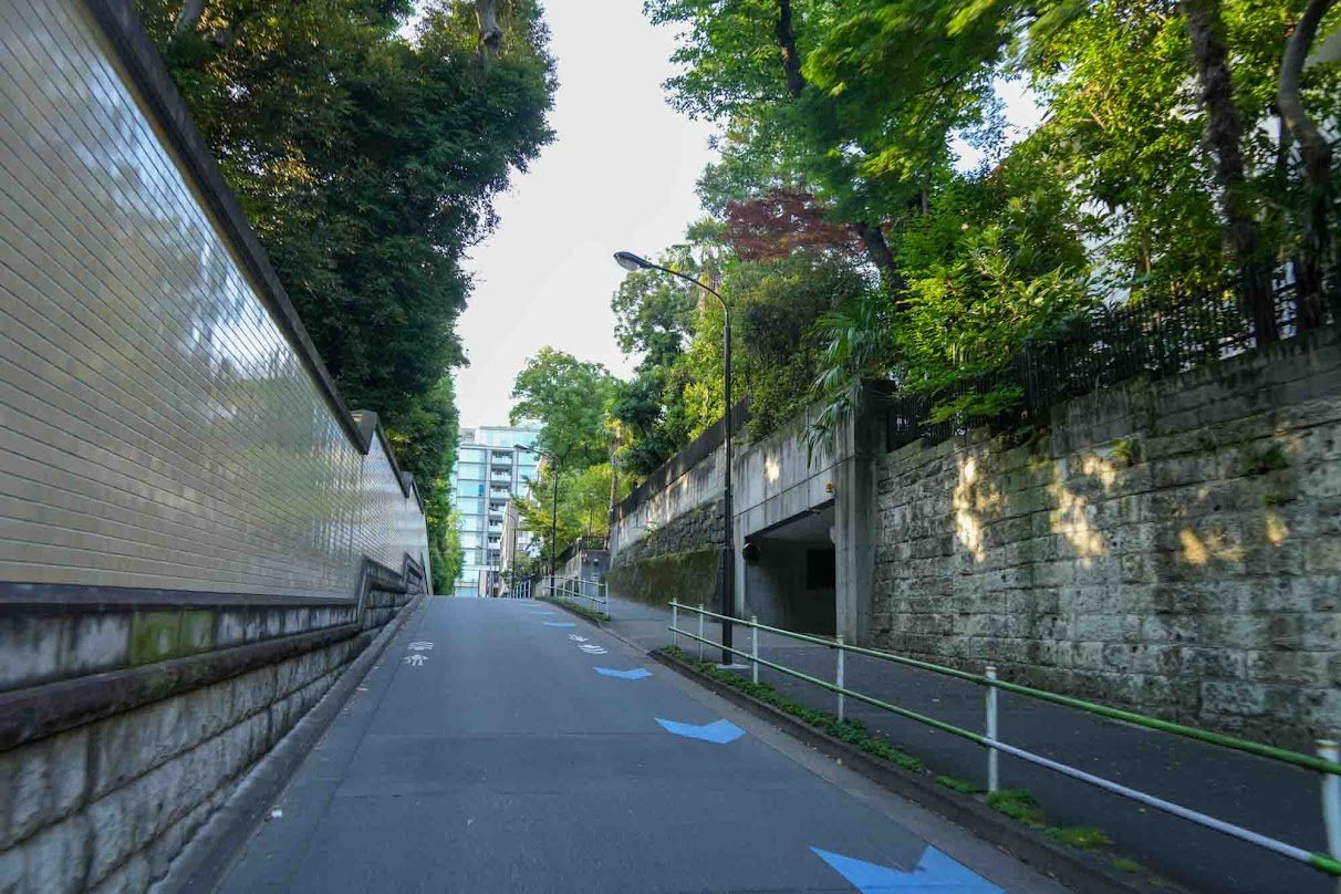 三田から芝方面へと続く「綱坂」は、地名の由来にもなっている由緒ある坂道。